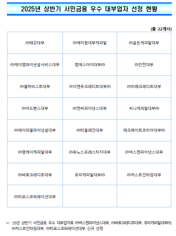 이렇게 해서 선정된 2025년 상반기 서민금융 우수 대부업체는 아래와 같습니다.